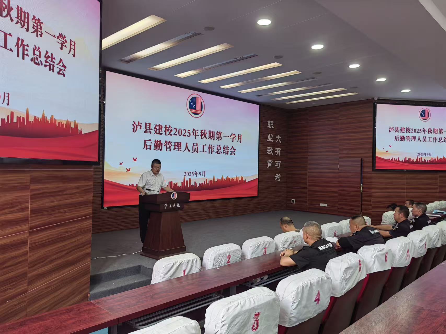 9月28日上午,瀘縣建校和保安公司組織全體后勤工作人員召開第一學(xué)月工作總結(jié)會。會議系統(tǒng)梳理了開學(xué)以來在校園安全、環(huán)境維護(hù)、設(shè)施保障等方面的工作成效、存在問題及下步改進(jìn)方向,向一線員工致以節(jié)日慰問,并部署下階段重點(diǎn)任務(wù),強(qiáng)調(diào)要持續(xù)優(yōu)化服務(wù)質(zhì)量,筑牢校園安全防線。